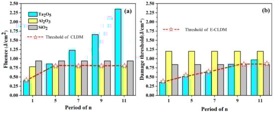The internal threshold of a Ta2O5 layer can be calculated from the damage threshold of Ta2O5/SiO2, as shown in Figure 6. The damage threshold of SiO2 and Al2O3 layers can be obtained from the previous work of our group [24,25]. Thus, the internal thresholds of Ta2O5, Al2O3, and SiO2 layers are 0.101, 0.337, and 0.430 J/cm2, respectively. Figure 8 shows theoretical damage thresholds of CLDM or E-CLDM with different numbers of Al2O3 periods. The threshold of CLDM or E-CLDM is decided by the lowest threshold value in layer materials.