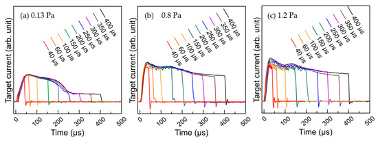 The current pulse shape of the Zr cathode with different HiPIMS voltage pulse width and under three different deposition pressures are shown in Figure 1. The current initially increases to the maximum in 20 to 50 μs. The higher the pressure is, the faster the current increases. This is due to the enhancement of ionization through increased species collisions at higher pressure [23,24,25]. For the pulse longer than 60 μs, the current decreases moderately after the maximum. Moreover, the current increases to about 150 μs. This second current peak could be attributed to the appearance of metal ions after the transformation from the argon sputtering stage into the self-sputtering stage [23,24,25]. The curves in Figure 1b,c are similar, but a drastically current drop occurred at about 150 μs on curves in Figure 1a. This current drop could be due to the gas rarefaction, and the pressure is too low to sustain the self-sputtering process [24]. The areas of current pulses of 1.2 Pa are slightly higher than those of 0.8 Pa but much higher than those of 0.13 Pa.