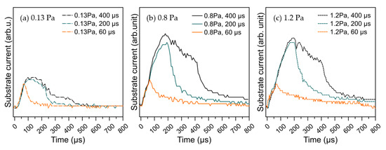 To confirm such difference among the excited ions at three deposition pressures and different pulse widths, the responded substrate current pulses are recorded by the built-in oscilloscope of the bias power supply while applying the synchronized −800 V substrate bias pulses with 1 ms pulse width. The substrate current represents the state of the incident ions toward the substrate. In order to clearly demonstrate the disparity, only three substrate current pulses of different HiPIMS pulse widths at each pressure are shown in Figure 2. The pulse width of 60 μs is shorter than the moment of the maximum current peak in Figure 1. The pulse width of 200 μs is just after the second current peak in Figure 1b,c, and the current drop in Figure 1a. The longest pulse width in this study is 400 μs. As shown in Figure 2, the area of the responded substrate current pulse extends with the target pulse width. Although the contributions of Ar or Zr ions on the substrate current remain indistinguishable, the extended area of current pulses indirectly evidences that the amount and the charge state of ions intensify with the pulse width. All the responded substrate current pulses in Figure 2 are broader than the corresponding target current pulse width in Figure 1. The peak currents of 200 μs and 400 μs in Figure 2 occur afterward comparing to the relevant pulses in Figure 1. Moreover, the delay elongates with increasing deposition pressure from 0.13 Pa to 0.8 Pa. The delay between pulses at 0.8 and 1.2 Pa is indistinguishable. Such delay at different deposition pressure could be attributed to several reasons, including the duration of the ion recycling, the transition from gas sputtering into self-sputtering, and the flight of ions from target to the substrate [23,24,32,38,40,41,42]. At the beginning of each HiPIMS pulse, the strong negative voltage on the target attracts back a large fraction of the gas ions and sputtered metal ions (ion recycling), which restricts the fraction of ions that reach the substrate until the conditions of the discharge current runaway are fulfilled [23,24]. The responded substrate current of target pulse width 60 μs is much lower than those of target pulse width 200 and 400 μs at all three pressures. This implies the ion flux or the ionization ratio of the sputtered species could be much lower when the pulse width is short. The relatively much lower currents at 0.13 Pa shown in Figure 1a and Figure 2a imply a lower ionization ratio of the Zr species, which is not a proper condition of the HiPIMS deposition of the Zr film. There is a current drop at about 200 μs in Figure 2a, which is consistent with Figure 1a. Therefore, pressures of 0.8 Pa and 1.2 Pa were chosen to deposit zirconium films for further experiments.