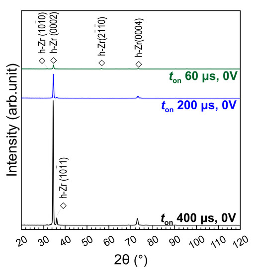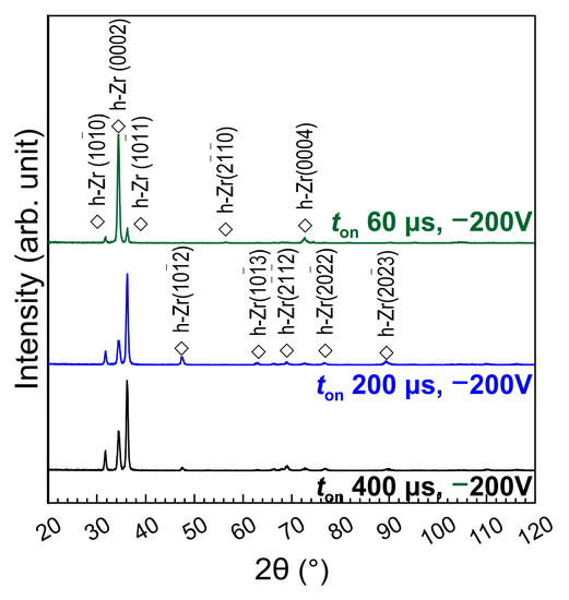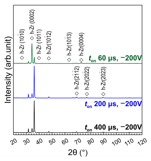 The density of excited ions and the portion of high energy ions both increase with the pulse peak power in a HiPIMS process [33]. Since the output voltage pulse waveform of the HiPIMS power in this work is near to a rectangular pulse with a voltage variation of 11%, the peak power can be considered in proportion to the current pulse width. The increased ion flux and ion energy provide higher mobility of adatom to diffuse further and to form a denser and crystalline structure [27,31]. The X-ray diffractograms of the deposited films in Figure 4 prove this assumption about the energy change of adatoms. There are only diffraction peaks of hexagonal close-packed α-phase of three films with different pulse widths. Without applying substrate bias, the deposited Zr films tend to exhibit a preferred orientation of (0 0 0 2). Since the three films are all thicker than 4 μm, the influences of film thickness on crystal structure can be ignored [20]. The peak intensity of preferred orientation enhances with elongating the pulse width indicates that the crystallinity of films also increases with the pulse width.