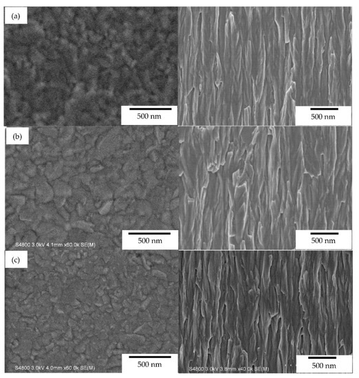 Top (left side) and cross-sectional (right side) SEM SE micrographs of Zr films deposited with the target pulse width of (a) 60 μs, (b) 200 μs, and (c) 400 μs, at the argon pressure of 0.8 Pa on the silicon wafer chips with applying synchronized substrate pulse bias −200 V.