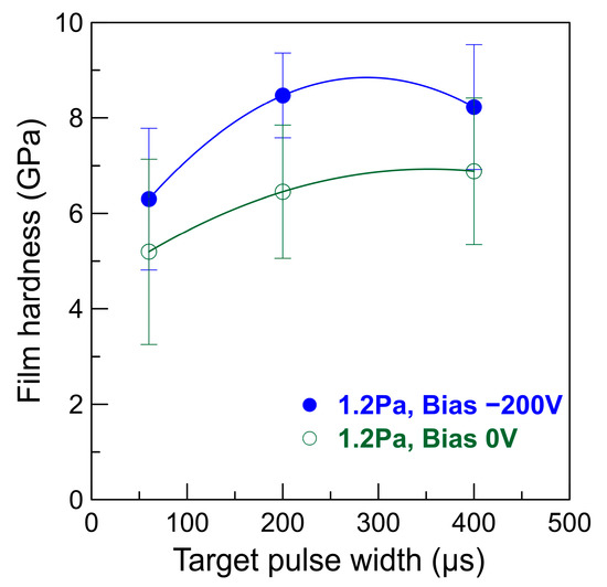 Film hardness versus the HiPIMS pulse width for Zr films deposited at the argon pressure of 1.2 Pa with and without negative substrate bias voltages.