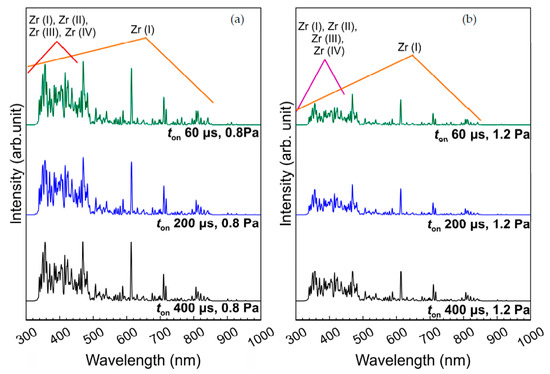 The XRD patterns of the Zr films of 0.8 Pa, as shown in Figure 9, are similar to those in Figure 6. However, the relative intensity of peak (1 0 1) for all three pulse widths is stronger than those of 1.2 Pa. This implies that the ionization ratio and the energy of excited ions for 60 μs pulse width at 0.8 Pa could be higher than that at 1.2 Pa. To investigate the difference of excited plasma species in these two argon pressures. The optical emission spectra were recorded during the film deposition at different pulse widths and working pressures, as shown in Figure 10. At a pressure of 1.2 Pa (Figure 10b), the intensity of emission peaks with a wavelength shorter than 440 nm all intensify with elongating pulse width. This means that the ionization ratio and high charged ions increase with the pulse width.
