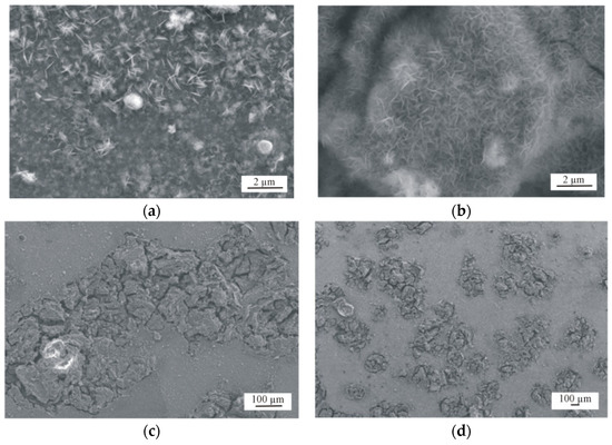 SEM images of the surface morphology of the TiO2 thin films deposited after: (a,c) 1500 and (b,d) 2000 cycles onto the MgCa2Zn1Gd3 alloy by ALD.