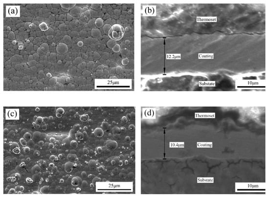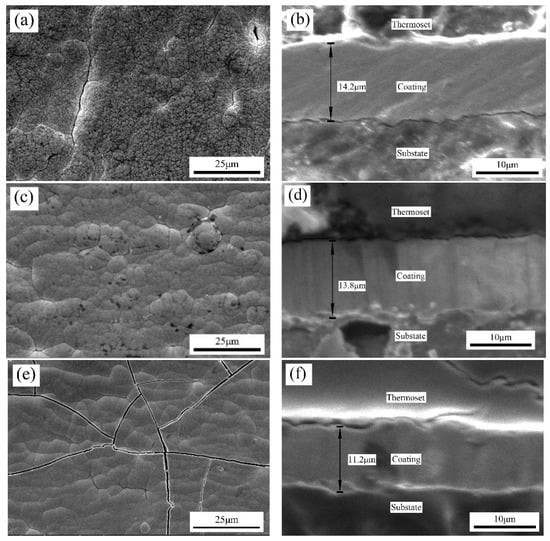 The surface and cross-sectional morphology, composition and phase structure of the coatings were characterized by scanning electron microscopy (SEM, FEI Instruments Inc., Hillsboro, OR, USA), energy dispersive spectroscopy (EDS, XFlash Detector 5030, Bruker AXS, Inc., Berlin, Germany) and X-ray diffraction (XRD, PANalytical X’pert, PANalytical, Inc., Almelo, Netherlands). The HighScore Plus software (version 3.0e) was used to analyze the XRD results. A microhardness tester (Duramin-40, Struers, Cleveland, OH, USA) was used to measure the microhardness of the coating surface, with a load of 50 g and a holding time of 10 s. Each sample was tested at seven different locations. The JB-4C surface roughness meter (Shanghai Optical Instrument, Shanghai, China) was used to measure the surface roughness of the coatings. The sampling length was 0.8 cm. Data were collected for each sample thrice, and the average value was finally obtained. The dry sliding friction and wear performance of the composite coatings were tested using a material surface performance comprehensive tester (CFT-1, Zhongke Kaihua, Lanzhou, China). The grinding parts were GCr15 alloy steel balls with diameters of 4 mm. The load was 330 g, the reciprocating sliding stroke was 5 mm, the reciprocating speed was 500 r/min, the wear time was 20 min and the sampling frequency was 1 Hz. A laser scanning confocal microscope (LSCM) (OLS4100, Olympus Corporation, Tokyo, Japan) was used to characterize the 3D morphology of the coatings after wear and to measure the volume and depth of the wear scar.