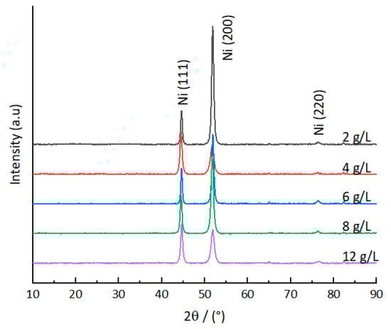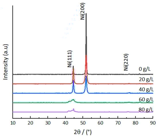 Figure 2 shows the XRD spectrum of the Ni–Mn alloy coatings prepared with different sodium citrate concentrations. Since the Mn content is relatively low and exists in the form of a solid solution solute, no evident diffraction peak related to the Mn element is observed in the XRD spectrum. With the increase in the sodium citrate concentration, the diffraction peak of the coatings gradually widens, and when the concentration reaches 60 g/L, a bun-shaped diffraction peak appears, and the structure becomes amorphous. The atomic radii of Mn and Ni are 132 and 124 pm, respectively. The atomic radii of Ni and Mn are similar, and during the electrocrystallization process, Mn atoms replace Ni atoms in the lattice to form a solid solution. With the increase in the deposition amount of Mn, the Ni lattice is distorted. When the Mn content is high enough, the lattice distortion is too high, thus breaking the original crystal structure and forming an amorphous structure with long-range disorder and short-range order [,]. The broadening of the diffraction peak is mainly due to the addition of sodium citrate, which increases the cathode overpotential and promotes the formation of crystal nuclei, thereby refining the grains.