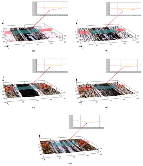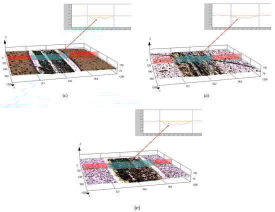 Figure 5 and Table 4 show the effects of sodium citrate concentration on the wear mark morphology and section parameter of the Ni–Mn alloy coatings. Evidently, the parameter of the wear marks is significantly changed. With the increase in the sodium citrate concentration from 0 to 40 g/L, the wear width, depth and scratch area all decrease. When the sodium citrate concentration is increased to 80 g/L, the wear mark width, depth and scratch area increases. When the concentration of sodium citrate in the bath reaches 60 g/L, the width, depth and scratch area of the wear marks are minimum. The wear resistance of the coatings is closely related to the surface morphology, microhardness, and surface roughness. The higher the microhardness and the lower the surface roughness of the coatings, the better the wear resistance of the coating surface []. Combined with Figure 5 and Table 4, the effect of sodium citrate concentration on the wear resistance of the coatings is analyzed as follows. When the Mn content is low, the strength of the coatings is insufficient, the resistance to adhesion wear is low and evident adhesion of the wear marks can be seen by observing the appearance of the wear marks. In a certain range, with the increase in the sodium citrate concentration, the Mn content in the coatings increases, the solid solution strengthening is enhanced and the compactness and mechanical properties of the coatings are improved, which influences the wear resistance of the coatings. When the sodium citrate concentration is 40 g/L, the microcracks that appear in the coatings can accommodate the abrasive particles generated in the wear process of the coatings to prevent the abrasive particles from participating in the wear process []. However, as the sodium citrate concentration continues to increase, the surface quality of the coatings decreases, and the microcracks gradually increase in number and widen, characterized by an increase in the grinding width and wear volume.