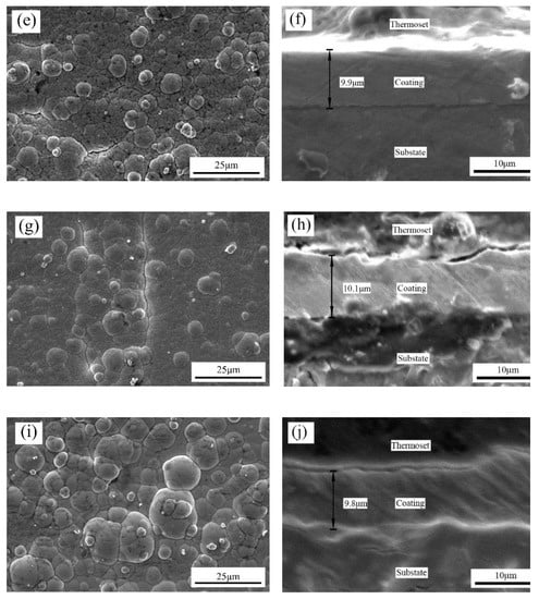 Surface and cross-sectional morphologies of coatings prepared with different SiC particle concentrations: (a,b) 2, (c,d) 4, (e,f) 6, (g,h) 8 and (i,j) 12 g/L.