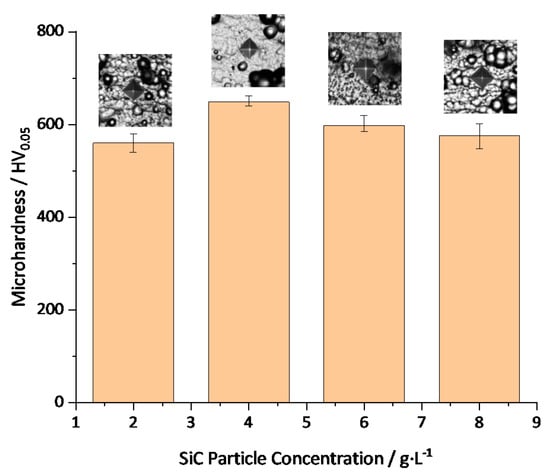 The microhardness of Ni-based composite coatings is related to particle strengthening, dispersion strengthening and grain refining. When the concentration of the second-phase ceramic particles is very low, the dispersion strengthening is the main effect. In this case, the matrix metal is subjected to a load, and the addition of second-phase ceramic particles inhibits dislocation motion. When the concentration of the second-phase ceramic particles is higher than a certain amount, particle strengthening plays the dominant role. The particles and the matrix metal are subjected to the load together, and too many particles are deposited on the coating surface, thus inhibiting the deformation of the substrate layer and resulting in particle strengthening []. According to the Orowan mechanism, as a type of high-hardness ceramic material, SiC particles exist in the composite coatings in the form of grain boundary and grain interior inlays, playing the role of dispersion strengtheners. SiC particles fill the defects between the Ni–Mn grains, improve the dislocation resistance of the grains, reduce the local deformation, enhance the cohesion of the coating, and improve the microhardness of the coatings []. As the SiC particle concentration increases, particle strengthening occurs, and SiC particles bear a part of the load of the matrix metal and reduce the deformation of the matrix layer and strengthening. When the SiC particle concentration in the plating solution exceeds a certain amount, the number of SiC particles adsorbed on the workpiece surface exceeds the containment capacity of the matrix metal. This is not conducive to the deposition of SiC particles [], and the probability of particle collisions increases. Moreover, the agglomeration phenomenon is strengthened, which not only reduces the dispersibility of the plating solution and the SiC nanoparticle content in the coatings but also reduces the uniformity of the nanoparticles, thereby decreasing the coating strength.
