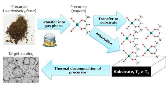 - Winter, C.H.; Knisley, T.J.; Kalutarage, L.C.; Zavada, M.A.; Klesko, J.P.; Hiran Perera, T. Metallic Materials Deposition: Metal-Organic Precursors. In Encyclopedia of Inorganic and Bioinorganic Chemistry; John Wiley & Sons, Ltd.: Hoboken, NJ, USA, 2011. [Google Scholar] [CrossRef]