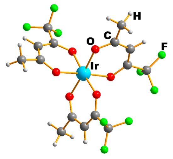 The traditional approach to the synthesis of iridium(III) β-diketonates consists in the interaction of iridium(III) chloride with the corresponding β-diketone or its salt in water-alcohol solutions with controlled pH [19,20]. However, the yields of the products do not exceed 15%–20%, since the reaction is complicated by the formation of monomeric and dimeric complexes of iridium(III) with γC-bound β-diketones [19], as well as heteroligand complexes of polymer structure formed as a result of competition between acetylacetonate and acido-ligands [21]. Isakova et al. [21] developed a universal method of the preparation of Ir(L)3 β-diketonates with high yields by the reaction of β-diketone with iridium(III) aquafluorocomplexes formed when a K3[IrF6] solution was heated in hydrofluoric acid. The method was based on the lability of fluoro- and aqua-ligands, which made it possible to substitute them with β-diketonate anions with high yields (up to 90%) and for a wide range of β-diketonates (L = acac, thd, tfac, hfac, ptac). All iridium(III) β-diketonates were shown to be mononuclear molecular complexes formed by chelating coordination of all three ligands. In the case of an asymmetric tfac-ligand, the formation of cis/trans isomers differing in thermal properties was confirmed; however, the crystal structure was determined only for trans-Ir(tfac)3 [22]. The structure of only one complex of this class, viz., Ir(acac)3, was also determined by the single-crystal XRD method [23]. Crystallographic data confirmed the bidentate coordination of β-diketonate ligands and the octahedral coordination environment of the metal in the molecule (Figure 2).