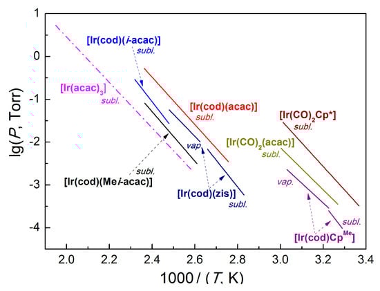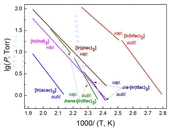 Temperature dependences of the saturated vapor pressure over the solid (sublimation process) and liquid (vaporization process) Ir(I) complexes and Ir(acac)3 for comparison.