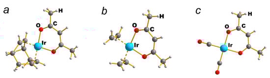Crystal structures have been determined only for a number of β-diketonate derivatives, some of which have been studied recently: [Ir(cod)(L)], L = acac [40], hfac [34], tfac, thd, btfac, ptac [33]; [Ir(CO)2(L)], L = acac [36], hfac [38]; [Ir(C2H4)2(acac)] [39]. In these molecules, the iridium atom is located in a typical distorted square environment: the coordination node IrO2C’2 (C’ is the center of the C=C bond) is realized for complexes with alkenes or IrO2C2 is for carbonyl derivatives (Figure 4). In the case of the [Ir(cod)(OAc)]2 acetate complex, the binuclear structure was proposed based on the measurement of molecular mass by the method of osmometry [30].
