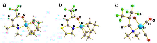 Carbonyl complexes [Ir(CO)2(L)] were synthesized by passing carbon monoxide gas into a solution of the corresponding cyclooctadiene derivatives [Ir(cod)(L)] [43,46]. However, in contrast to the methods of preparation of β-diketonate complexes, the [Ir(cod)(L)] complexes themselves were not isolated, but generated in situ through the reaction of stoichiometric quantities of [Ir(cod)Cl]2, NaH, and HL with the high (70–80%) yields of all target complexes, with the exception of L = nPri-hfac (50%).
