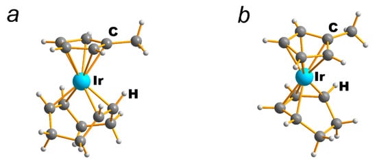 Despite the fact that methods for the synthesis of cyclopentadienyl complexes of iridium(I) have been known since the mid-20th century, only five complexes with cyclooctadiene and one with cyclohexadiene have been structurally characterized: [Ir(cod)CpMe] [48], [Ir(cod)CpMe4] [49], [Ir(cod)CpMe5] [50], [Ir(cod)(Cp-propenyl)] [51], [Ir(cod)(Cp-ipropenyl)] [52], [Ir(chd)CpMe] [54]. In all complexes, the cyclopentadienyl ligand is coordinated by the central atom according to the η5-type, while cyclooctadiene and cyclohexadiene are coordinated according to the η4-type (Figure 6).