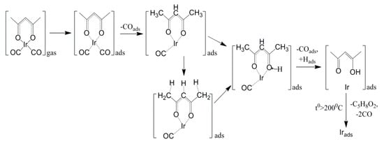 For the [Ir(CO)2(acac)] complex, experimental results obtained by in situ mass spectrometry [25] were recently supplemented by quantum chemical modeling, which allowed us to present a more complete picture of the process [63]. Calculations have shown that the decomposition of the molecule in the gas phase begins with the cleavage of one of the Ir–O bonds. When the molecule is adsorbed on the substrate, a structural rearrangement occurs, which consists of a noticeable increase in the lengths of the Ir–O and Ir–C bonds, and the carbonyl and methyl groups are located out of the complex plane. Thus, the decomposition of the precursor on a heated surface proceeds by a different mechanism than in the gaseous phase, i.e., with the cleavage of Ir–C bonds at the first stage during a removal of CO molecule. The process is schematically presented in Figure 8.