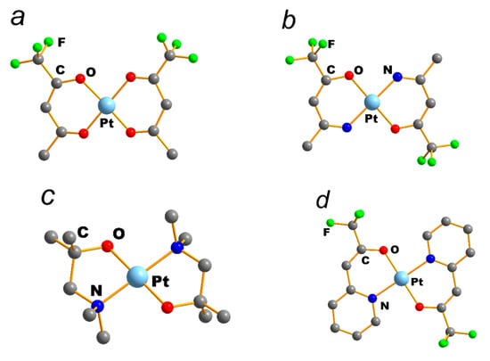 - Baidina, I.A.; Zharkova, G.I.; Piryazev, D.A. Structure and properties of the volatile isomers of bis(1,1,1-trifluoro-5,5-dimethylhexane-2,4-dionato) of platinum(II). J. Struct. Chem. 2016, 57, 1188–1194. [Google Scholar] [CrossRef]