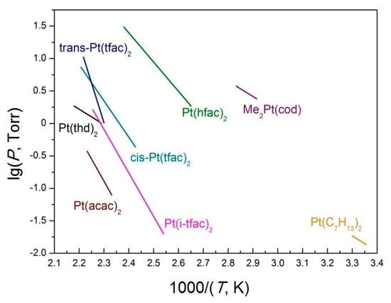 - Zharkova, G.I.; Sysoev, S.V.; Baidina, I.A.; Stabnikov, P.A.; Igumenov, I.K. Vapor pressure and crystal structure of platinum(II) trans-bis-(trifluoroketoiminate). J. Struct. Chem. 2005, 46, 494–500. [Google Scholar] [CrossRef]