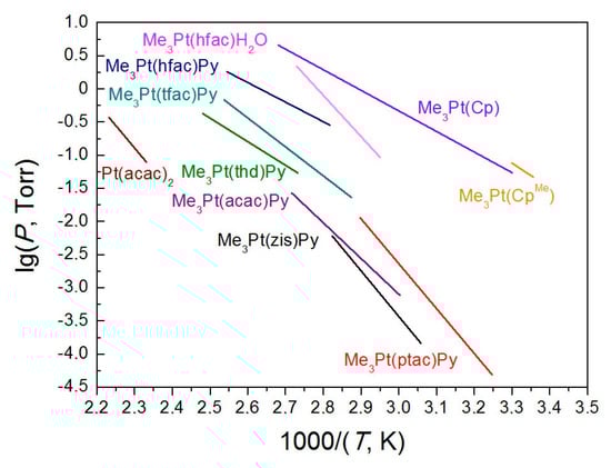 The growing interest in the chemistry of volatile platinum and iridium compounds is confirmed by the regular appearance of thematic reviews [14,15,16,17,18]. While the latest data on new iridium precursors were collected in 2015 [18], the latest review of platinum precursors was published in 2008 [15], and further reviews have only covered certain aspects of their application [17]. It is also worth mentioning that the recent reviews covered various classes of precursors, including specific and general synthesis concepts, and then focused mainly on applications in MOCVD processes, while the thermal properties of the compounds have received much less attention.