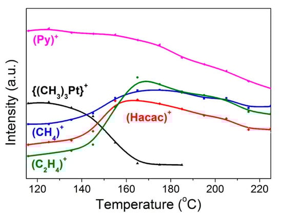 It was shown by the method of in situ mass spectrometry that the decomposition of Ir(acac)3 vapors in vacuum and in the presence of hydrogen on a heated surface began at 410 °C with the release of fragments of the acetylacetonate ligand into the gaseous phase. In the presence of oxygen, the initial decomposition temperature reduces to 220 °C, and the final decomposition products are water vapor and carbon dioxide [25]. Recently, a mechanism of Ir(tfac)3 vapor under electron impact at 160 °C has been proposed [20].