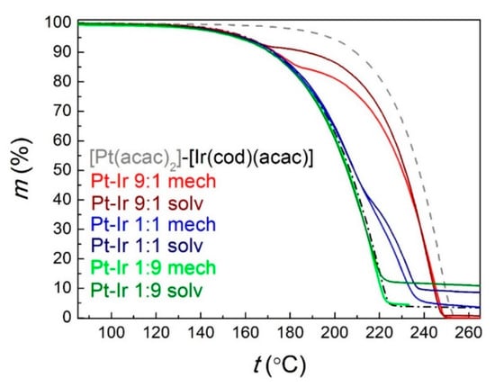 It should be noted that vaporization of all the studied complexes [Ir(cod)(L)] with (O^N)-donor ligands is accompanied by decomposition [42,44,45] and for β-heteroarylketonate [Ir(cod)(ThTFP)] the mass loss curve corresponds only to decomposition with a clear cleavage of the anionic ligand at the first stage [41]. According to [42] and [43], it can be assumed that β-iminoketonates are the most volatile among [Ir(cod)(L)] and [Ir(CO)2(L)] complexes with the studied classes of (O^N)-coordinated ligands, whereas β-iminoalcoholates are the least volatile. However, very different masses and substituents in the ligands of this series (L = Eti-hfac, amakN(Me)2, nPri-hfda) do not allow us to make a final conclusion.