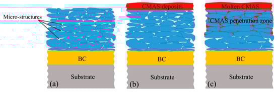 Schematic diagram of the penetration process of CaO-MgO-Al2O3-SiO2 (CMAS) into atmospheric plasma spraying (APS) TBCs []: (a) Structure of TBCs, (b) CMAS depositing on the TBCs surface, (c) Liquefied CMAS penetrating the top ceramic coating.