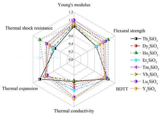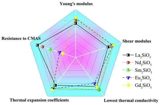Radar chart for comparison of the properties of X2-RE2SiO5 [].