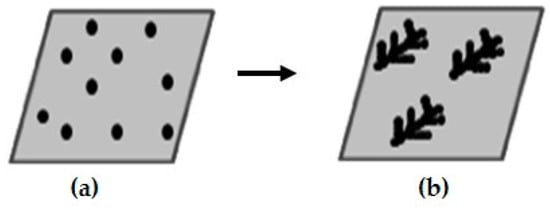 Besides the deposition mechanism, the dissolution was also studied, and the results demonstrated that the Al deposits underwent a corrosion process gradually indicative of unstable nature of the deposit, and complicated kinetics signifying the effect of impurities. So far, most of the deposition of Al was carried out mainly employing the simplest chloroaluminate IL systems listed in Table 3 and resulted in a good deposition. Though there were many reports published on successfully electrodepositing aluminum using ILs, most of them have focused on chloroaluminate-based ILs. One of the distinctive features of the chloroaluminate-based IL systems is that electrochemical reduction of Al on the substrate occurs via Equation (1) at 100% coulombic efficiency. Also, deposition of Al under galvanostatic conditions influences the morphological features of Al deposit significantly and is represented by the general schematic, as shown in Figure 1. When current densities ≤40 mA cm−2 are applied while employing the chloroaluminate-based IL systems during the deposition of Al, dense, and crystalline deposits are formed [25]. On increasing the current density beyond 40 mA cm−2, dendritic Al deposits are observed on the cathode surface. Change in the Lewis acidity due to the depletion of reducible [(Al2Cl7)]− species at the surface of the cathode during the deposition at high current densities, was shown to the responsible factor related to the morphological changes of the Al deposit.