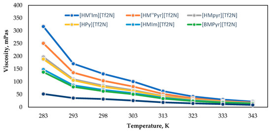 Figure showing the comparison of viscosity of air and water-stable ILs with cationic chain lengths at different temperatures: 283:343 K. Cations: [HM’Im]+; [HM’Pyr]+; [HM’’pyr]+; [Hpyr]+; [HMIm]+; [BMpyr]+;[EMIm]+. Anion: [Tf2N]−. Plotted based on the data from [40].