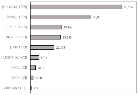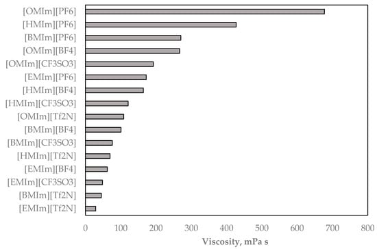 Figure showing the comparison of viscosity of air and water-stable ILs as a function of chain length at 298 K. Anions: [Tf2N]−; [BF4]−; [PF6]−; [CF3SO3]. Cations: [EMIm]+; [BMIm]+; [HMIm]+; [OMIm]+. Plotted based on the data from [41,65]