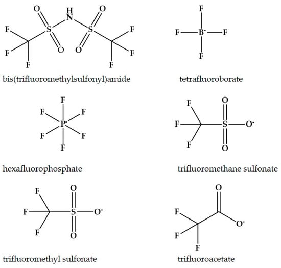 Anions in ILs play a vital role in tailoring certain physicochemical properties such as viscosity, conductivity when paired with different cations. While cations control melting points, lattice energies of the ILs, anions influence the coordination geometry, cathodic deposition current and nucleation characteristics of the Al deposit, and the reduction potential of either the Al or Al alloy metals to be deposited. Considering the number of ILs that has been introduced with variety of cation–anion arrangements and combinations, it is possible to design the ILs with desired physical, chemical, and electrochemical properties for various applications, including electroplating and cater different industry segments. Reviews by El Abedin and Endres [64], presented a detailed understanding of this topic. The cation–anion interaction combined with their ability to form an IL shall not only influence the solution properties, transport properties, but also the deposition conditions, electrochemical behavior, deposit properties. Anions can be inorganic (chloride, bromide, fluoride, tetrafluoroborate) or organic ([CF3SO3]−, [Tf2N]−); discrete or complexed. Figure 4 shows the viscosities of various IL systems with different anions commonly used in the deposition of Al at 298 K (25 °C), which were plotted based on the data from [41,65] and Figure 5 show the schematic of the anion structures that are commonly used for preparing ILs. Among them, [Tf2N]-, [BF4]-, [PF6]-, [CF3SO3]- are the most commonly employed anions used in the preparation of ILs that are used for the deposition of Al. As can be seen from Figure 4, the viscosities of ILs follow the order: [PF6]− > [BF4]− > [CF3SO3]− > [Tf2N]− with [Tf2N]− being the lowest. This suggests that the presence of [Tf2N]− ions shall ease the movement of ions within ILs owing to their excellent charge delocalization behavior when relative to the other anions and facilitate good transport of Al metal ion species to the cathode surface, favor a good deposition.