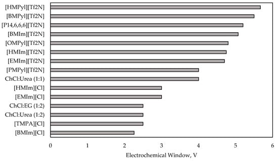 - Hayyan, M.; Mjalli, F.S.; Hashim, M.A.; AlNashef, I.M.; Mei, T.X. Investigating the electrochemical windows of ionic liquids. J. Ind. Eng. Chem. 2013, 19, 106–112. [Google Scholar] [CrossRef]