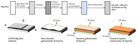 Tang et al. [91] introduced an additional zincating pretreatment prior to copper ion-assisted surface activation of the AZ91D Mg alloy substrate and obtained a well-adherent Al deposit on the pretreated substrate. Pre-deposition of fine Cu particles during surface activation aids the Zn deposition (during zincating process) by acting as seeds on both α (an Mg solid solution phase) and β-phase (an intermetallic phase MgxAly) areas of AZ91D substrate and facilitated better adhesion of the final Al deposit. Presence of Cu2+ ions in surface activation prior to zincating, contributed to obtaining a uniform Zn layer on AZ91D Mg alloy substrate during the zincating pretreatment. The formation of highly dense fine Cu layer prior to zincating acted as active nucleation sites which favored Zn deposition on the surface. Employing the zincating pretreatment followed by Al deposition with an increase in current density beyond 8 mA cm−2 increased the Al nucleation density during the initial galvanostatic electrodeposition. During the electrodeposition, the entire replacement of Zn by Al took place, and as a result, the substrate gets covered completely with Al deposit of nominal thickness. Such deposits are referred to as dense coatings. The density and morphological characteristics of such Al deposits are significantly influenced by the polarization method and deposition conditions. For instance, increasing the current density from 8 mA cm−2 to 15 mA cm−2 via the galvanostatic mode resulted in Al coatings with good density and adhesion(adhesion strength: 8–9 MPa). The adhesive strength of Al coatings was reported to be improved to >11 MPa via the bipolar current pulse (BCP) mode deposition when the cathode polarization current was increased up to 25 mA cm−2 while keeping the anodic polarization current at lowest value (0.5 mA cm−2). Increasing the cathodic current density increased the nucleation density of the initial Al deposit when deposited on zincated Mg alloy by galvanostatic mode. Increasing the cathodic polarization current in the BCP mode while keeping the anodic polarization current decreased the duty cycle ratio (rC) helps to maintain the sufficient Al(III) ion concentration surrounding the cathodic surface, favoring a uniform, smooth and denser deposit with good coverage. Figure 7 shows the representative schematic, which shows the pretreatment procedure that has been developed for the surface preparation of Mg-based alloys prior to Al deposition in ILs, which resulted in a well adherent deposit. Also, the work by [92,93] demonstrated the effect of zincate pretreatment on adherence of the Al deposit to the Mg alloy substrate and the mode of deposition improved the uniformity of Al deposits. The Al deposit obtained on non-zincated Mg alloys was reported to be porous which resulted in a poor corrosion resistance, demonstrating the importance of zincate pretreatment.
