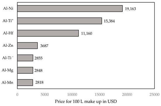 Plot showing the cost comparison of the ionic liquid-based systems for the deposition of Al-X alloys considering the initial make up of 100 L solution. Al-Ti’ represents the deposition of Al-Ti alloy from solution containing TiCl2 and Al-Ti” represents the deposition of Al-Ti alloy from solution containing TiCl4.