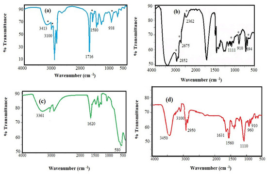 The stability of Ag or Fe3O4 against oxidation in the presence of peroxyacetic, which act as a strong oxidizing agent, to form other oxides such as Ag2O, AgO, FeO and Fe2O3 during their preparation was elucidated from their chemical structures using FTIR as represented in Figure 1a–d. In this respect, FTIR spectrum of ELNA (Figure 1b) was compared with LNA spectrum (Figure 1a) to confirm the epoxidation of LNA as representative for EOA or ELOA (their FTIR spectra were not represented here for brevity). The saturation of LNA isolated double bonds was confirmed from the disappearance of HC=CH absorption bands at 3100, 1580 and 938 cm−1 attributed to =CH stretching, C=C stretching and C=C bending vibrations, respectively from chemical structure ELNA (Figure 1b) as compared to LNA (Figure 1a). Moreover, the appearance of new bands at 1110, 910 and 694 cm−1 attributed to –C–O–C stretching and bending vibrations of epoxide ring (ELNA; Figure 1b) elucidates the epoxidation of LNA [32]. The increasing of bands intensities of COOH, and aliphatic CH2 stretching vibration bands at 3450 or 1716 cm−1, and 2852, 2675 or 2362 cm−1, respectively in ELNA spectrum (Figure 1b) indicates that the epoxy groups were increased and widened [32]. The formation of magnetite without oxidation was also confirmed from the appearance of strong band at 580 cm−1 refereed to Fe–O stretching of magnetite in ELNA-Fe3O4 (Figure 1c) [28]. The shifting of absorption bands of C=O stretching, O–H in-plane and out-of-plane bending vibration bands of ELNA bands that appeared at 1620–1631, 1462 and 937 cm−1, respectively in ELNA-Ag (Figure 1d) and ELNA-Fe3O4 (Figure 1c) spectra to the lower field were observed. The shift to a lower frequency region indicates that the hydrocarbon chains of ELNA in the monolayer surrounding the Fe3O4 and Ag NPs are in a close-packed, crystalline state [31]. The new bands at 1560 and 1110 cm−1 appeared in FTIR spectrum of ELNA-Ag (Figure 1d) that attributed to the asymmetric –COO– stretching of the acid-base complex (–COO–NH3+) and C–N stretching, respectively confirm that LNA forms complex with the OAm during the Ag NPs preparation. The appearance of characteristic bands of epoxide ring at 1110, 910 and 694 cm−1 in all spectra of Ag NPs elucidates the epoxidation of unsaturated fatty acid after synthesis (Scheme 1). The formation of silver oxides NPs cannot confirm from their FTIR spectra.