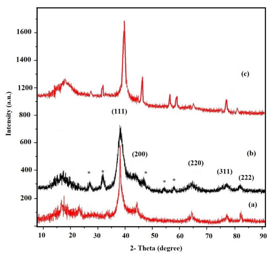 XRD diffractograms of (a) ELOA-Ag, (b) ELOA-Ag and (c) ELNA-Ag NPs.