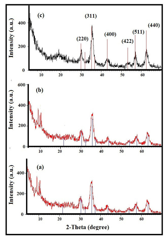 The formation of Ag NPs or their oxides was elucidated from their XRD patterns represented in Figure 2a–c. The presence of epoxide fatty acid combined with OAm was confirmed from the appearance of broad peak at 2θ ranged from 15° to 20°. All five diffractions peaks assigned to Ag NPs at 2-theta about 38.1°, 42.1°, 64.5°, 77.5°and 83.4° referred to (111), (200), (220), (311) and (222) lattice planes, respectively were appeared (Figure 2a–c). These peaks are clearly distinguished and broadened confirm the formation of face-centered cubic (FCC) Ag NPs crystal structure [34]. The appearance of new diffraction peaks of ELOA-Ag (Figure 2b) and ELNA-Ag (Figure 2c) at 2θ about 32.06°, 65.03° and 79.84° were indexed to (111), (220) and (311) planes of Ag2O (JCPDS no. 00-012-0793) [35]. The presence of AgO NPs was examined from the peaks appeared at 2θ 26.5° and 46.57° that could be attributed to (111), and (200) planes. Accordingly, it could be concluded that the epoxidation of LOA and LNA after formation of silver nanoparticles produces Ag NPs mixed with AgO and Ag2O NPs. Moreover, this also indicates that EOA has a great tendency to protect Ag NPs from oxidation due to its strong capping efficiency more than ELOA or ELNA. It is also observed that the broadness of the diffraction peaks in the XRD patterns of Ag NPs were increased by using ELOA > EOA > ELNA (Figure 2a–c) which reflects that the lowering in the particles sizes in the same order. In this respect, the (111) plane was used to calculate the particle sizes of Ag NPs capped with EOA, ELOA and ELNA (Figure 2a–c) using the classical Debye-Scherrer equation [36]. The average diameters of the Ag NPs capped with EOA, ELOA and ELNA (Figure 2a–c) were calculated as 55.3, 45.8 and 85.9 nm, respectively. The XRD diffractograms of EOA-Fe3O4, ELOA-Fe3O4 and ELNA-Fe3O4 NPs were summarized in Figure 3a–c, respectively. All magnetite diffractograms show the diffractions peaks assigned to Fe3O4 at 2-theta about 30.65°, 35.86°, 43.5°, 54.01°, 57.38° and 63.04° referred to (220), (311), (400), (422), (511) and (440) lattice planes, respectively (Figure 3a–c). This observation confirms that the EOA, ELOA and ELNA form stabilized capping agents protect the magnetite from further oxidation to other iron oxides [28]. The (311) plane was used to calculate the diameter of EOA-Fe3O4, ELOA-Fe3O4 and ELNA-Fe3O4 NPs using the Debye-Scherrer equation, which are 25.3, 18.2 and 21.8 nm, respectively.