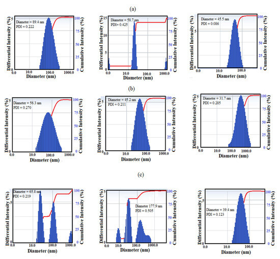 The particle size diameters of capped TiO2, Ag and Fe3O4 NPs capped with EOA, ELOA and ELNA and their polydispersity index (PDI) were determined from DLS measurements in toluene and represented in Figure 4a–c, respectively. The particle sizes of TiO2 (left Figure 4a–c) were increased from 20 nm to 89.4, 56.3 and 65.8 nm when they were capped with EOA, ELOA and ELNA, respectively. Moreover, their PDI values were arranged in the order ELNA-TiO2 > ELOA-TiO2 > EOA-TiO2, respectively. These data confirm that monodisperse TiO2 were obtained with using EOA as capping that increases TiO2 particle sizes to confirm that more EOA capped TiO2 that ELNA or ELOA, respectively (Figure 4a–c). These data confirm the uniform sizes and dispersion of EOA-TiO2 as hydrophobic NPs in toluene more than ELNA-TiO2 and ELOA-TiO2. This was referred to increasing the polarity with increasing the epoxy contents on ELNA leads to an increase in the hydrophobic interactions and interfacial adhesion of NPs than EOA [37]. The particle size diameters of Ag NPs capped with EOA, ELOA and ELNA (middle, Figure 4a–c) agreed with that determined from XRD. While the bigger particles sizes diameters of Fe3O4 NPs capped with EOA, ELOA and ELNA (right side Figure 4a–c) did not agree with the data determined from XRD analysis, which attributed to that the DLS measurements were evaluated in suspension solutions. The big particle sizes of magnetite using DLS measurements was referred to the presence of a solvent layer of toluene that interacted with hydrophobic EOA, ELOA or ELNA and a magnetic field of NPs [38]. Uniform dispersion of NPs using an in-situ technique to synthesis of either Ag or Fe3O4 was obtained by using EOA (low PDI value; Figure 4a), which had more uniform dispersion than ELOA and ELNA (Figure 4b,c).