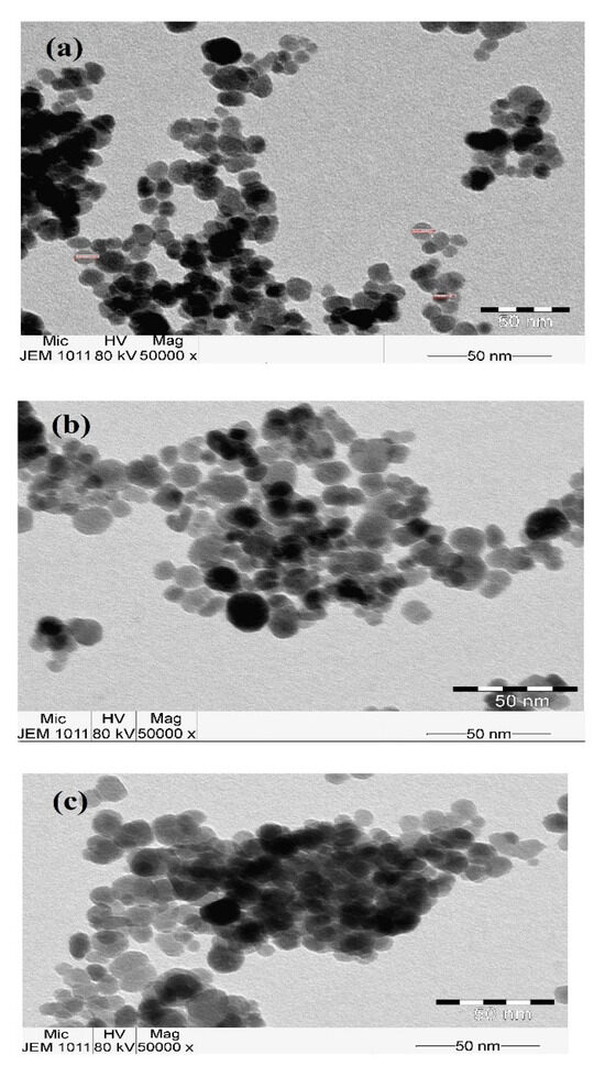 The morphology of the capped TiO2, Ag and Fe3O4 NPs with EOA, ELOA and ELNA was investigated from TEM micrographs summarized in Figure 5, Figure 6 and Figure 7. The uniform spherical capped TiO2, Ag and Fe3O4 NPs were obtained when EOA was used (Figure 5a, Figure 6a and Figure 7a). The spherical particles morphologies of Ag and Fe3O4 NPs elucidate the good capping efficiency using the in-situ technique [39]. Moreover, no aggregates are visible on the surface of NPs with using EOA (Figure 5a, Figure 6a and Figure 7a). There some aggregates were obtained when ELOA was used as capping for TiO2 NPs (Figure 5b). The Ag and Fe3O4 appeared as black dots inside the spherical core, which is in accordance with the previously capped NPs using the in-situ technique [39]. ELOA cape forms NPs agglomerates with both TiO2 and Ag NPs and form interconnected stretched spherical morphology with some particles of irregular shape (Figure 5 and Figure 6c). These data elucidate that the morphology of Ag NPs was affected more than other metal oxide NPs that have hydroxyl groups on their surfaces such as TiO2 or Fe3O4 that interacted with the surrounded capping agents having carboxyl groups [40]. Moreover, the formation of bilayer of hydrophobic modified EOA, ELOA and ELNA was increased with the presence of the strong covalent interaction OAm and fatty acid complex on the Ag NPs [28]. The epoxidation of LOA and LNA having more vinyl groups leads to silver oxides that affect the surface morphologies of Ag NPs especially for that coated with ELOA (Figure 6c). The Ag NPs sizes and shapes were controlled more with using EOA (Figure 6a) or ELOA (Figure 6b) due to the formation of either monolayer or bilayer capped structure that behaves as micelle to make the crystal growth to be performed inside the micelle core. The Ag NPs crystal growth was extended outside the core when ELNA was used due to the higher epoxy contents.