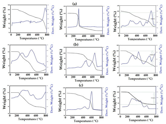 TGA-differential thermogravimetric analysis (DTG) thermograms ordered from left to right as Fe3O4, Ag and TiO2 NPs capped with (a) EOA, (b) ELOA and (c) ELNA.
