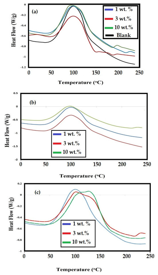 It is expected also that the increasing of epoxy weight percentages occurred due to blending of the DGEB epoxy system with NPs capped with epoxydized fatty acids would affect the crosslinking density of the produced epoxy networks. It was proposed that EOA, ELOA and ELNA will link with PA either as dangling chains (linked with the epoxy chain via its one end group and the second end does not link and free) or incorporated into the epoxy matrix from two sides especially that modified with ELOA or ELNA. Moreover, the dispersion of inorganic NPs based on TiO2, Fe3O4 and Ag into the cured epoxy matrix will change the thermomechanical properties of the cured epoxy nanocomposites such as flexibility or rigidity of the cured epoxy networks. In this respect, the glass transition temperatures (Tg; °C) of the cured DGEB/PA in the absence (blank) and presence of different weight percentages of the NPs were determined from DSC and DMA as reported in the Section 2. The curing exothermic peaks of the cured DGEB/PA in the presence of ELNA-Fe3O4, ELNA-TiO2 and EOA-Ag NPs were selected and represented in Figure 12a–c. The Tg values of the modified TiO2, Fe3O4 and Ag NPs were summarized in Table 2.