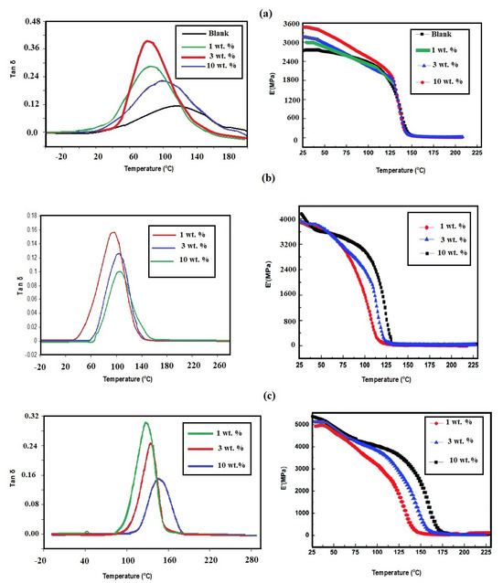 DMA analyses based on the relation of the tan δ or storage modulus versus curing temperatures of the cured DGEB/PA in the presence of different wt % of modified (a) EOA-Fe3O4, (b) EOA-TiO2 and (c) Ag NPs.