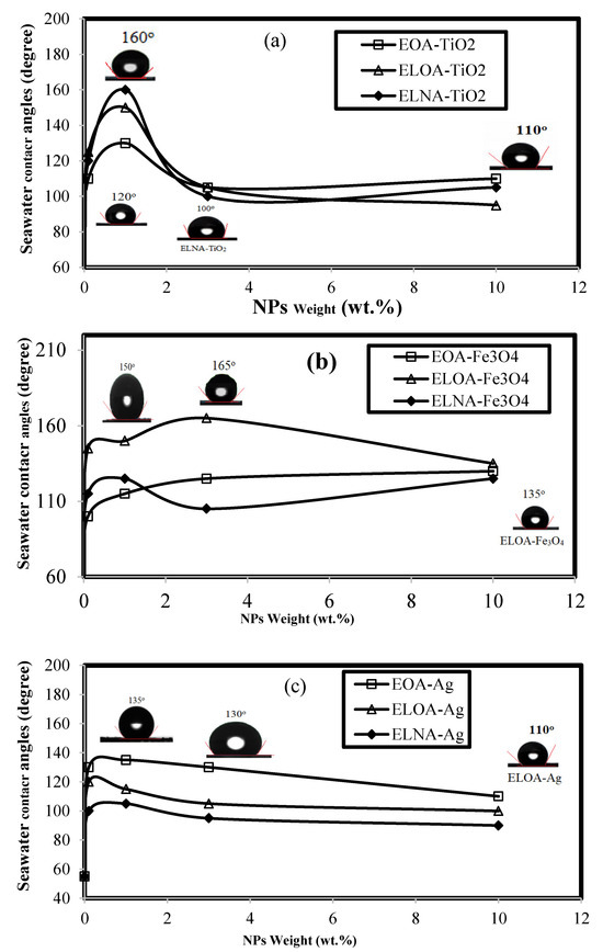 Seawater contact angle (WCA) measurements on the cured DGEB/PA nanocomposites with modified (a) TiO2, (b) Fe3O4 and (c) Ag NPs wt %.