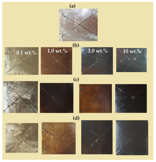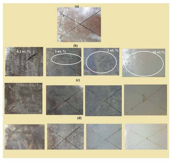 Salt spray resistance of the cured DGEB/PA in the presence of different weight % of (a) blank, (b) EOA-TiO2, (c) ELOA-TiO2 and (d) ELNA-TiO2 NPs.