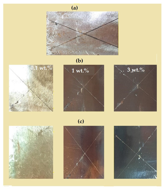 Salt spray resistance of the cured DGEB/PA in the presence of different weight % of (a) blank, (b) OA-Ag and (c) EOA-Ag NPs.