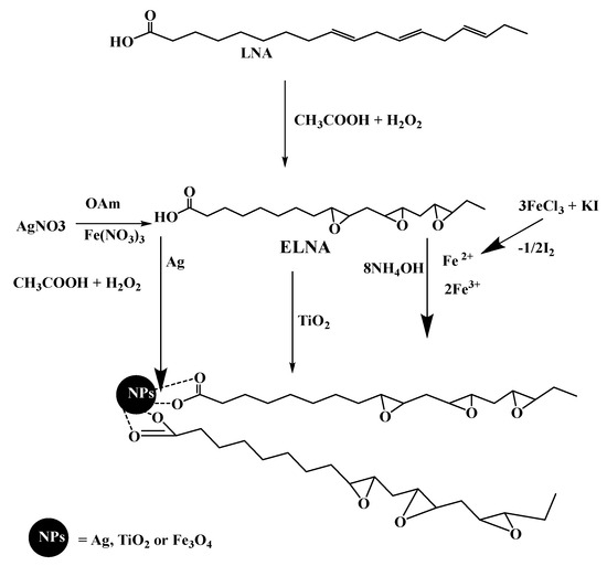 The modification of magnetite (Fe3O4) NPs with EOA, ELOA and ELNA was carried out during preparation of NPs using the in-situ technique. The modification of silver (Ag) inorganic NPs with an epoxide group was completed after their preparation and modification with OA, LOA and LNA the presence of OAm. While TiO2 NPs were modified directly with EOA, ELOA and ELNA as capping agents.