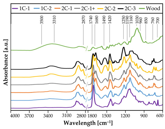 The characteristic peaks in the recorded ATR-FTIR spectra (Figure 1) are associated with the chemical properties of the applied topcoat on the particular surface system [38]. Polyurethane typically consists of isocyanate-capped macromolecular chains containing urethane groups in their backbones, usually with a 1–15 wt.% free isocyanate concentration [39]. All the analyzed coatings exhibited some common peaks, typical of urethane-based polymers, but also some differences in the recorded spectra. Only 1C-1 showed a high peak at 700 cm−1, which is related to the C–H bending of the styrene [40]. The sharp peak at 760 cm−1 is due to the C–N bond vibration, indicating the presence of urethane bonds. The peaks at 960 and 1160 cm−1 are attributed to the C–N–C stretch vibration in the isocyanurate ring [22]. The stretching vibration at 1190 cm−1 for C–O shows the reaction of hydroxyl (OH) groups present in wood and atmospheric humidity with the coating by hydrogen bonds or by ester formation [15]. The peaks at 1250, 1420 and 1490 cm−1 indicate the stretching of C–O–C, C–H and C–O, and –NH2 vibrations in C–NH and (CO)–NH urethane groups in the polymer chains [26,41,42]. The lower intensity of the band at 1420 cm−1 of 1C-1 and 1C-2 indicates the polymerization of acrylate double bonds (CH2=CH twisting vibration) [41]. The band at 1680 cm−1 shows the C=O stretching vibrations in unsaturated acids [22] and NH–(C=O)–NH of polyurea. This band was not detected in the spectra of 1C-1 and 1C-2. The sharp stretching region around 1740 cm−1 signalizes the free C=O stretching vibration of urethane [41,42] and shows the presence of an acrylate group in all types of coatings [22]. The same peak also clearly indicates the formation of urethane in cured coatings [26]. The NCO absorption band at 2275 cm−1 is not seen, indicating that the –NCO group has reacted completely with OH of water solvent [26,41,42]. The band at 2870 cm−1 is attributed to C–H2 stretching [41,42]. All spectra show C=C–O, −NH, −OH and C=O functional groups, and a broad absorption band corresponding to the hydrogen bond between the −NH group and the C=O group can be observed at 3310–3500 cm−1 [22,26,41]. The intensity of this absorption band is particularly pronounced for 2C-2 and 2C-3.