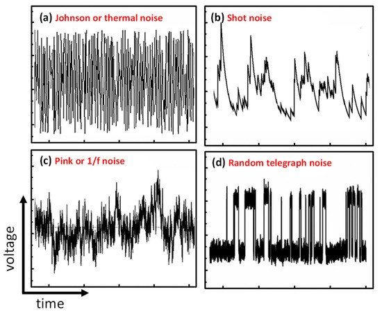 - random telegraph noise (Figure 1d), consisting of sudden step-like transitions between two or more discrete voltage or current levels.