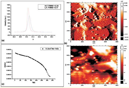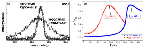- Orgiani, P.; Adamo, C.; Barone, C.; Galdi, A.; Pagano, S.; Petrov, A.Y.; Quaranta, O.; Aruta, C.; Ciancio, R.; Polichetti, M.; et al. Epitaxial growth of La0.7Ba0.3MnO3 thin films on MgO substrates: Structural, magnetic, and transport properties. J. Appl. Phys. 2008, 103, 093902. [Google Scholar] [CrossRef]