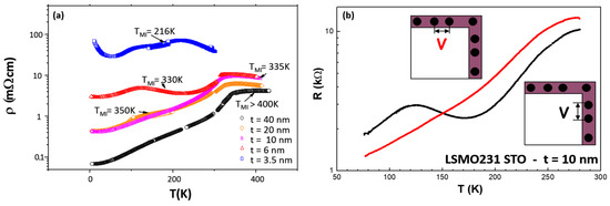 - Sun, J.Z.; Abraham, D.W.; Rao, R.A.; Eom, C.B. Thickness-dependent magnetotransport in ultrathin manganite films. Appl. Phys. Lett. 1999, 74, 3017–3019. [Google Scholar] [CrossRef]